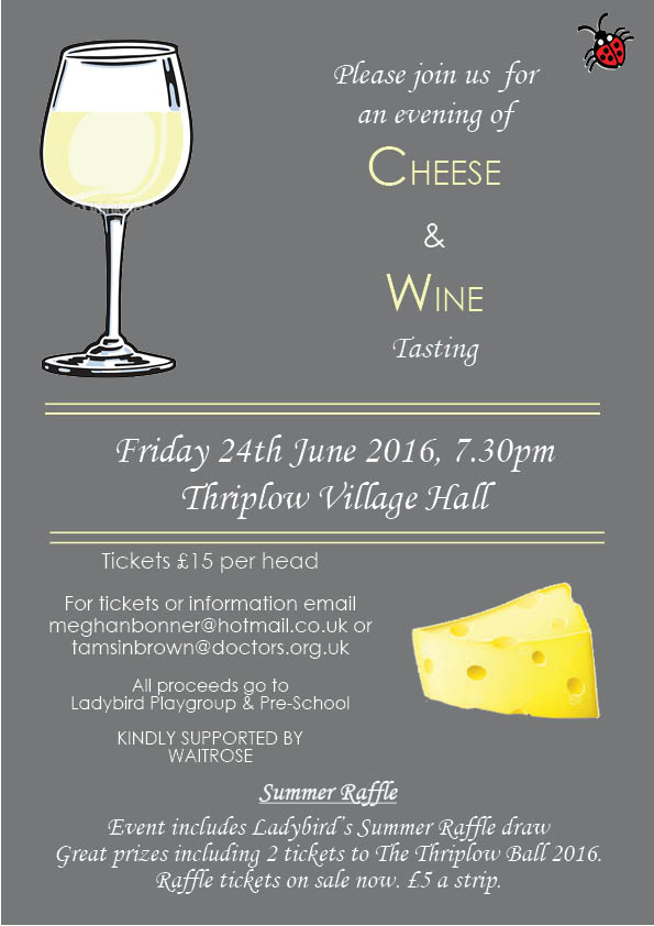 Please let us know if you would like to buy tickets or a table (tables of 8, 10 or 12 people) for our summer wine tasting event on June 24th to raise money for Ladybird playgroup. Let us know quickly as over 50% of tickets have already gone.